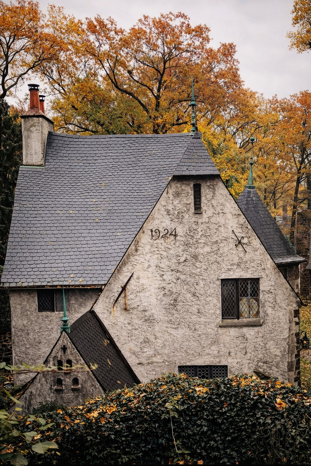 The home is attributed to architect R. C. Hunterby and dates to approximately 1924, a period when Fieldston’s architectural ambitions were at their height. Hunterby’s design embraces the romantic traditions of the English Arts and Crafts movement, translated through a distinctly American lens. Architectural details were deliberately expressive: the slate roof was designed with a subtle, intentional sag, reinforcing the hand-crafted character of the structure and its departure from rigid formality.